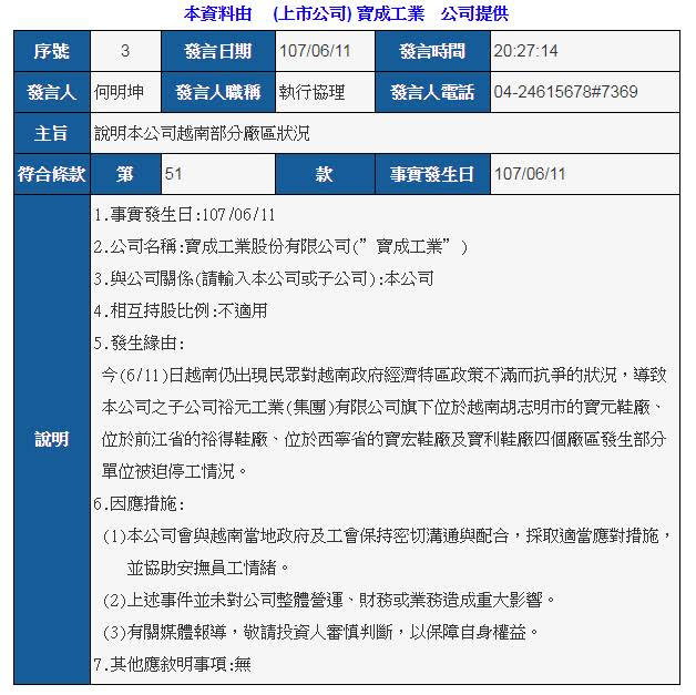 寶成工業11日發布重大訊息表示,6月11日越南仍出現民眾對越南政府經濟特區政策不滿而抗爭的狀況,導致本公司之子公司裕元工業(集團)有限公司旗下位於越南胡志明市的寶元鞋廠、位於前江省的裕得鞋廠、位於西寧省的寶宏鞋廠及寶利鞋廠四個廠區發生部分單位被迫停工。寶成工業表示,公司會與越南當地政府及工會保持密切溝通與配合,採取適當應對措施,並協助安撫員工情緒。此外,上述事件並未對公司整體營運、財務或業務造成重大影響。